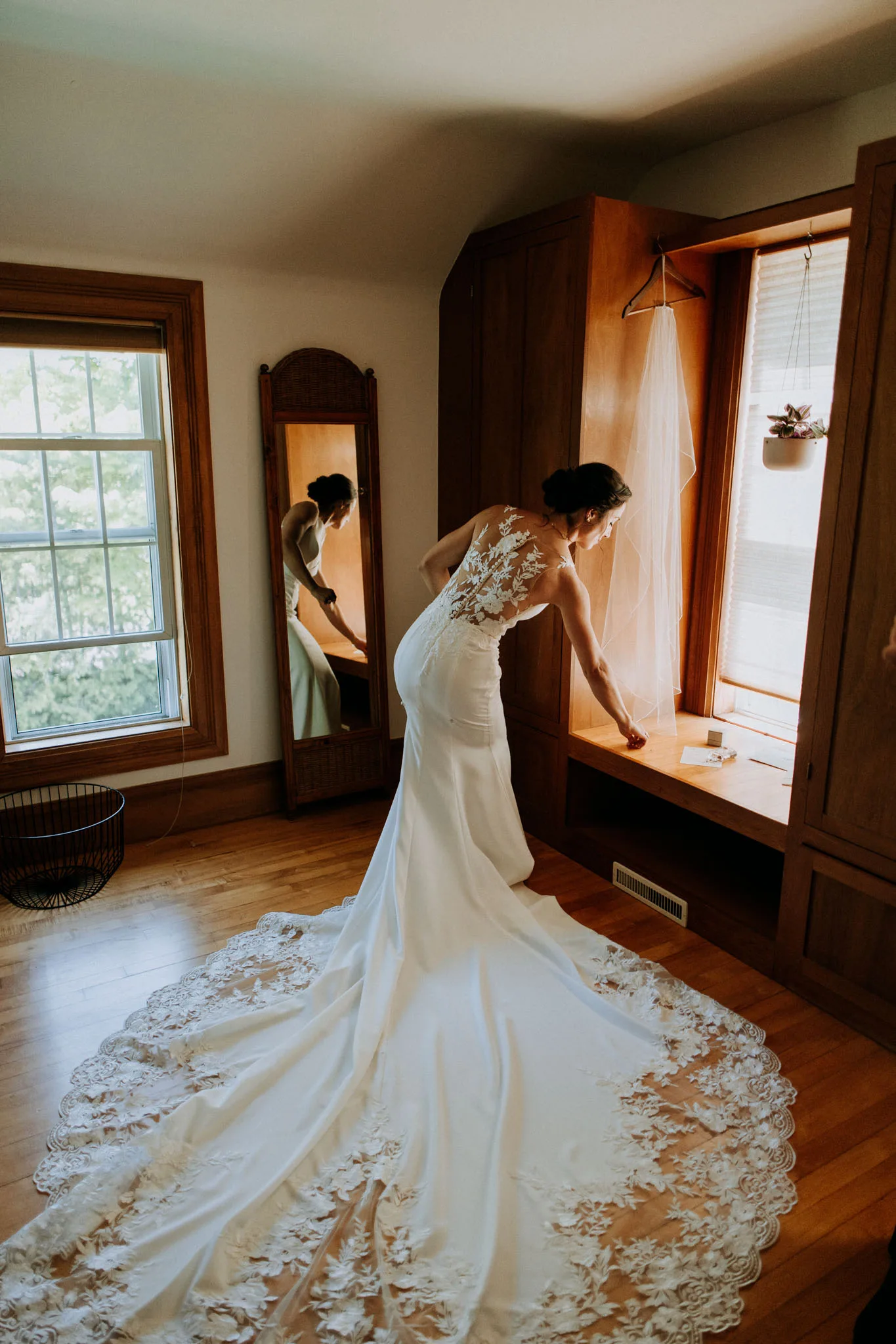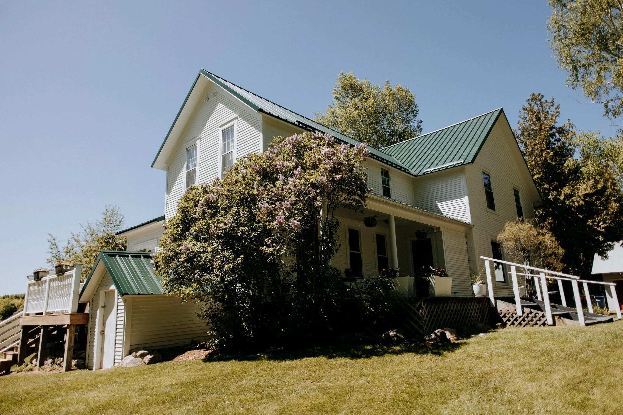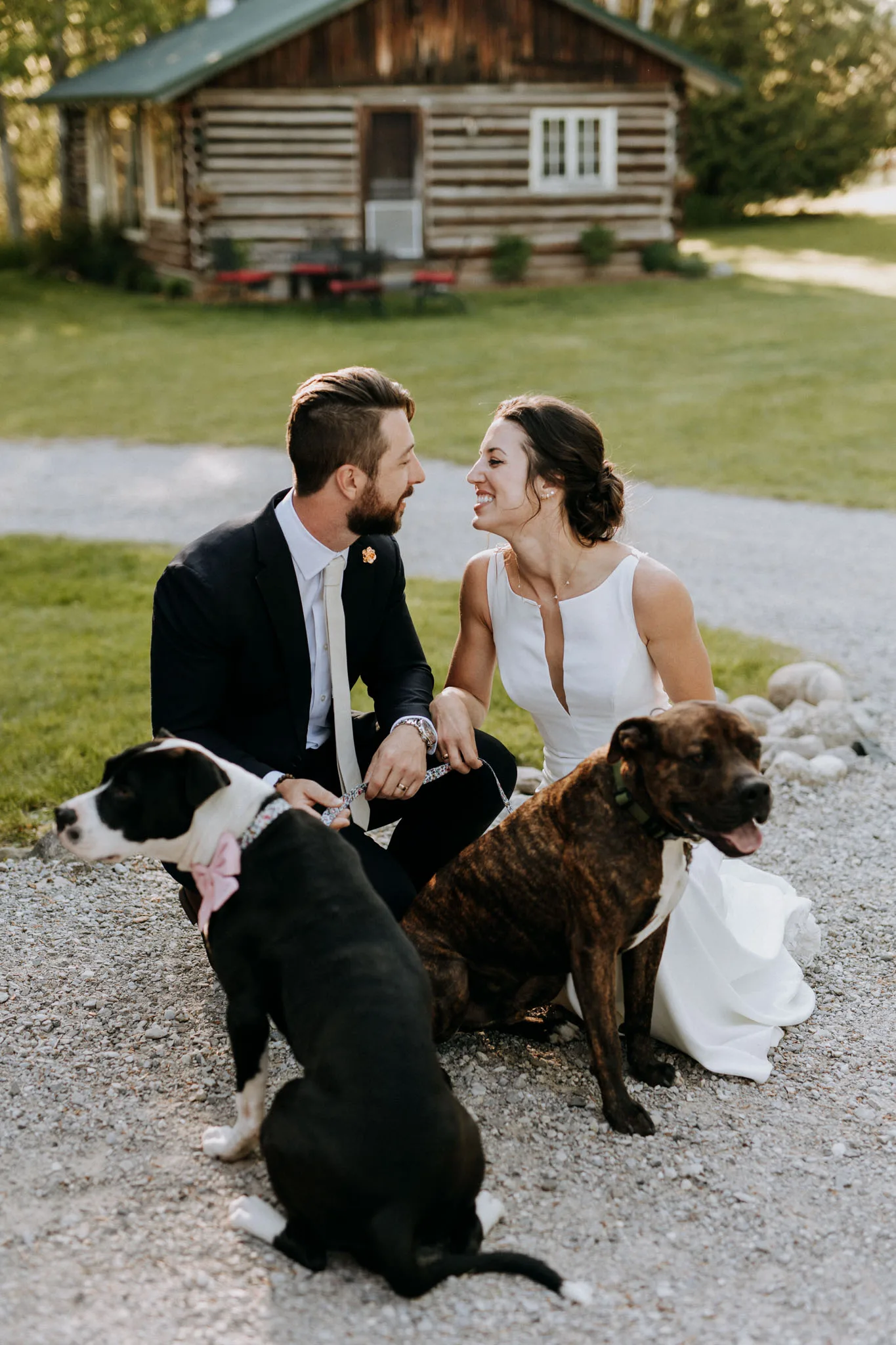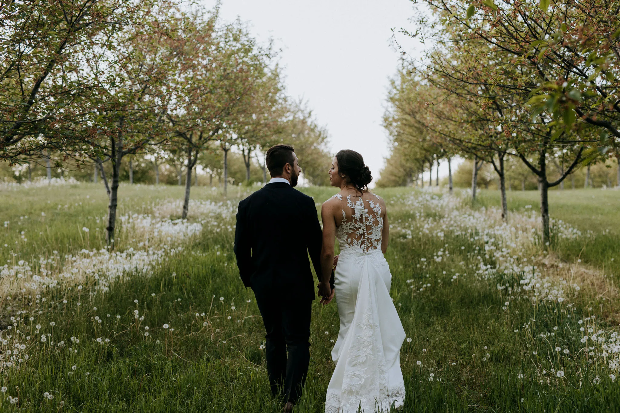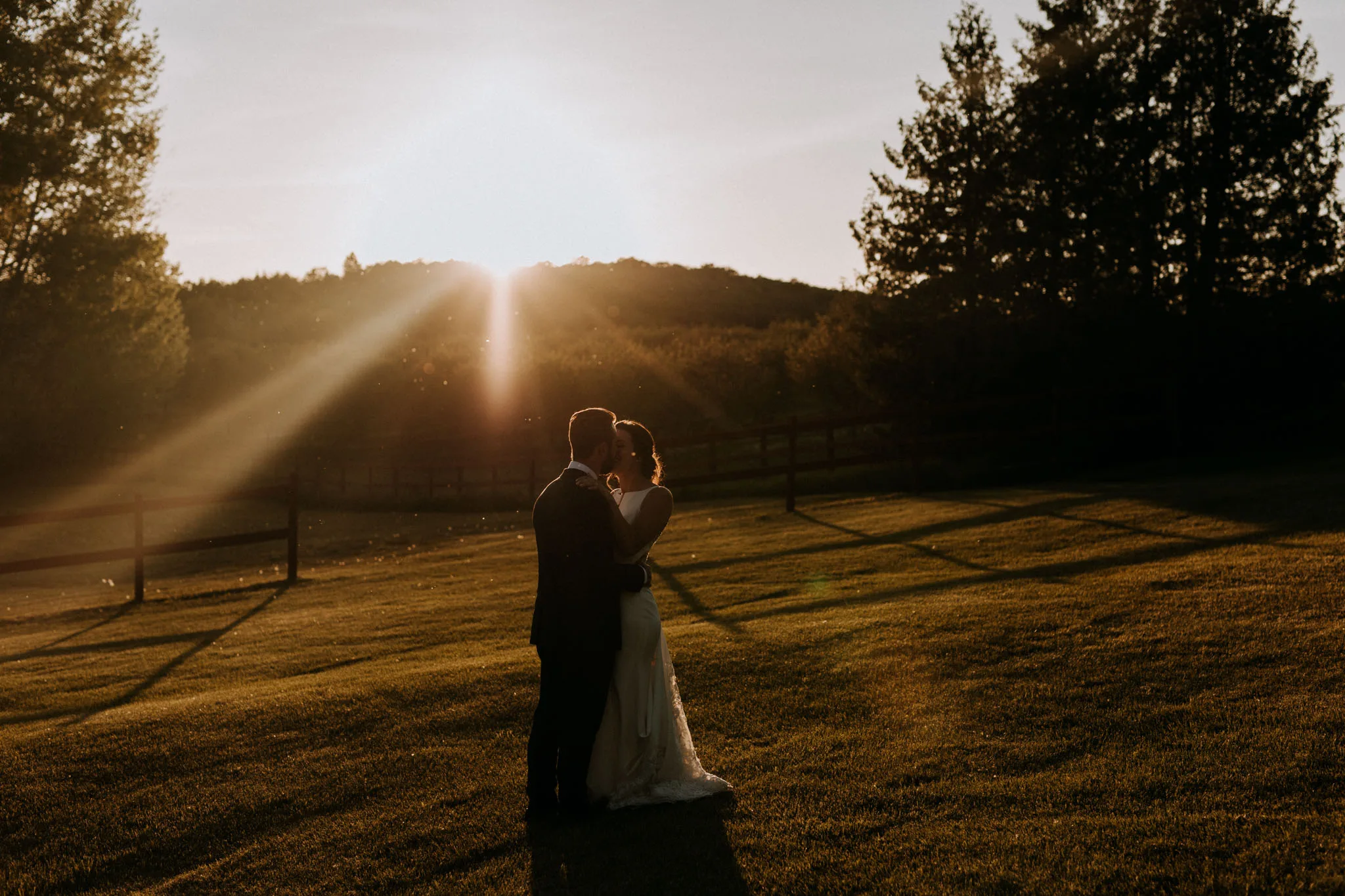 We did portraits in the late afternoon, just the two of them, while the light was still angled and useful. Candace and Ben moved through the property without a lot of direction needed. They were comfortable together in the way that comes from actually knowing each other well rather than from being told to act natural. The barn's south-facing wall held the warmth long after the ceremony wrapped, and that's where some of the best frames came from -- not from anything posed, just from the two of them standing in good light and talking.