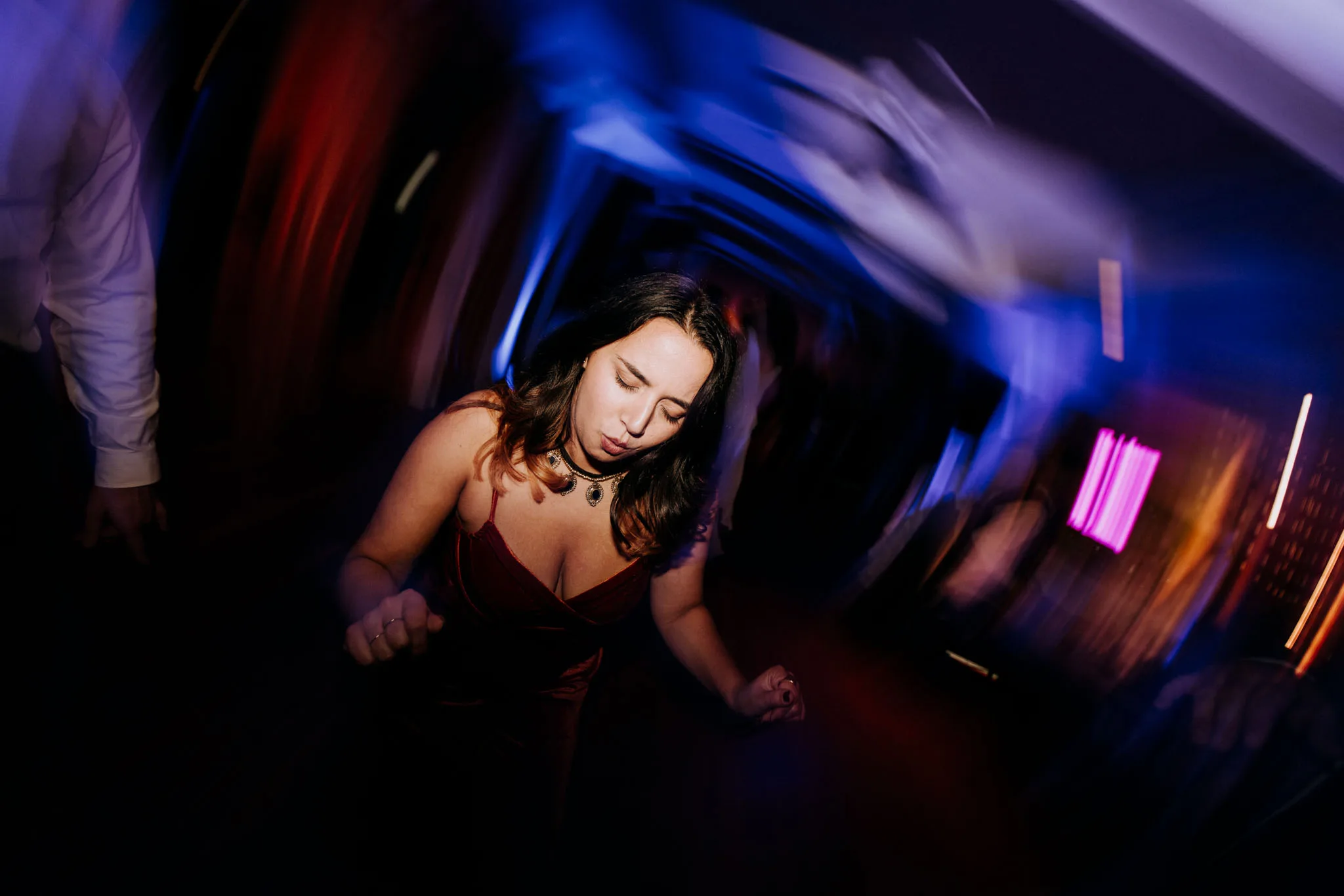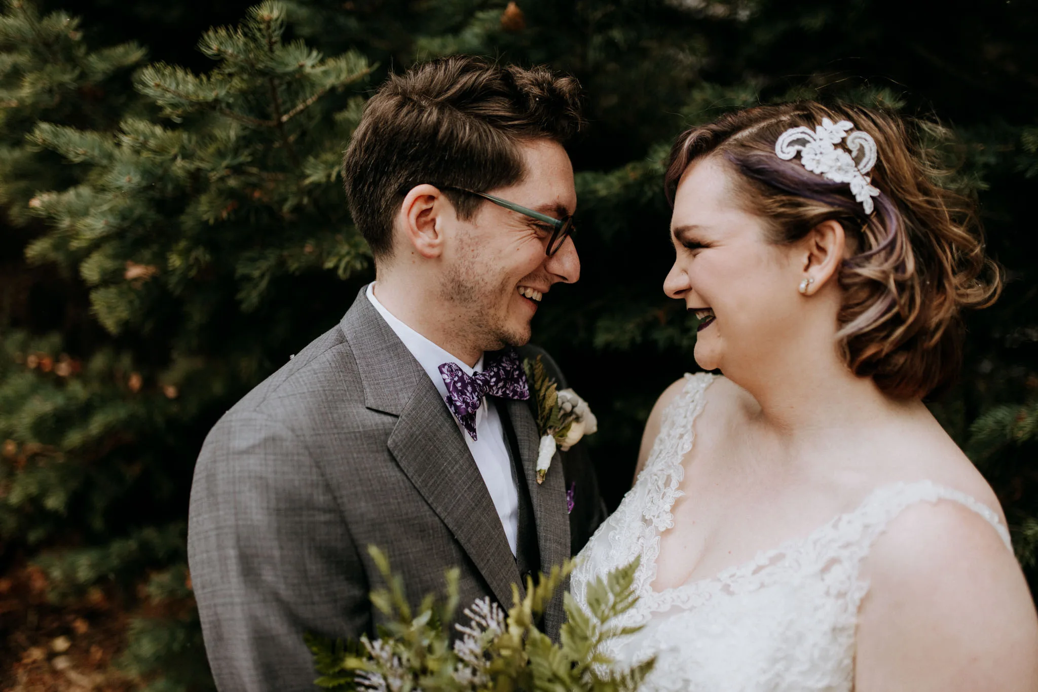 After the ceremony, we walked along the river for portraits. The snow was still coming. Sarah's dress held a dusting of it along the hem. Nathan kept looking at her the way grooms do in the first hour after it is done, still processing what just happened. The light was soft and close and completely indifferent to any plan I had coming in. That was fine. Some of the best frames from this whole day came from exactly those conditions, that overcast November softness that you cannot manufacture in summer.
