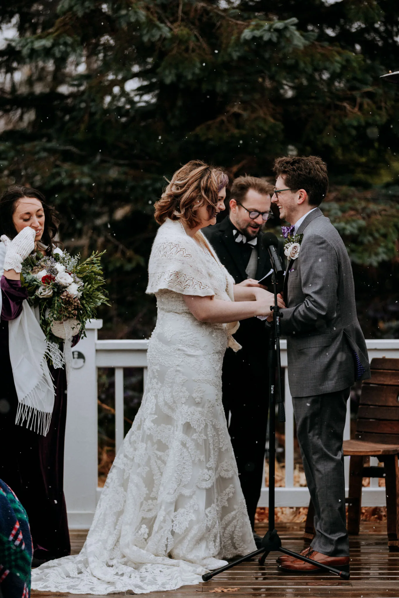 They had known it might snow. That is the thing about choosing November in Northern Michigan. You are not exactly gambling, but you are not ruling anything out either. Sarah had a coat for the portraits. Nathan wore his suit without one. The snow came down through the vows and into the first hour after, and it changed the whole day in a way that clear skies simply could not have. Everything felt quieter, more concentrated, more real.